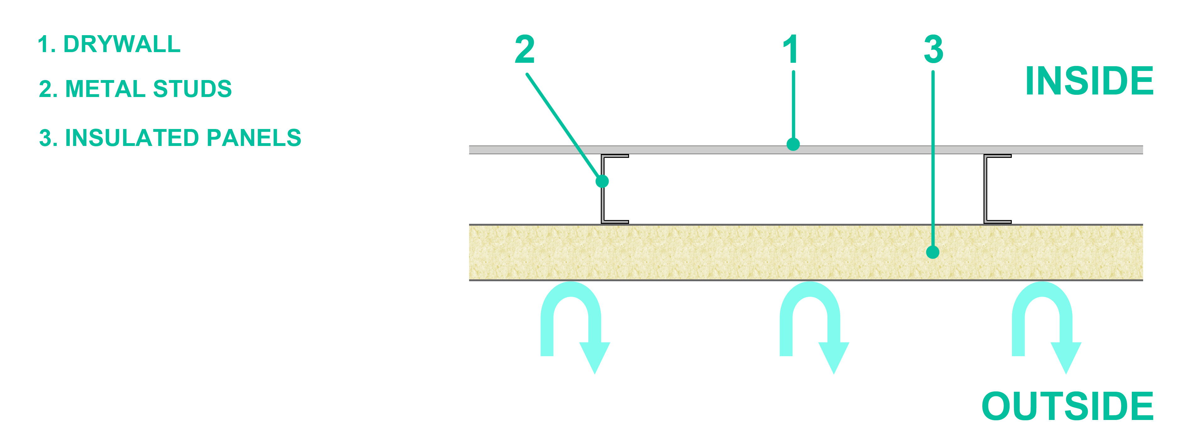 With an assembly system using an outer layer of insulated panels (picture below), thermal bridging does NOT occur because the insulating material (which has among the highest R value found in the construction industry), is placed outside the metal studs, making it impossible to both cool and heat to travel into the indoor space.