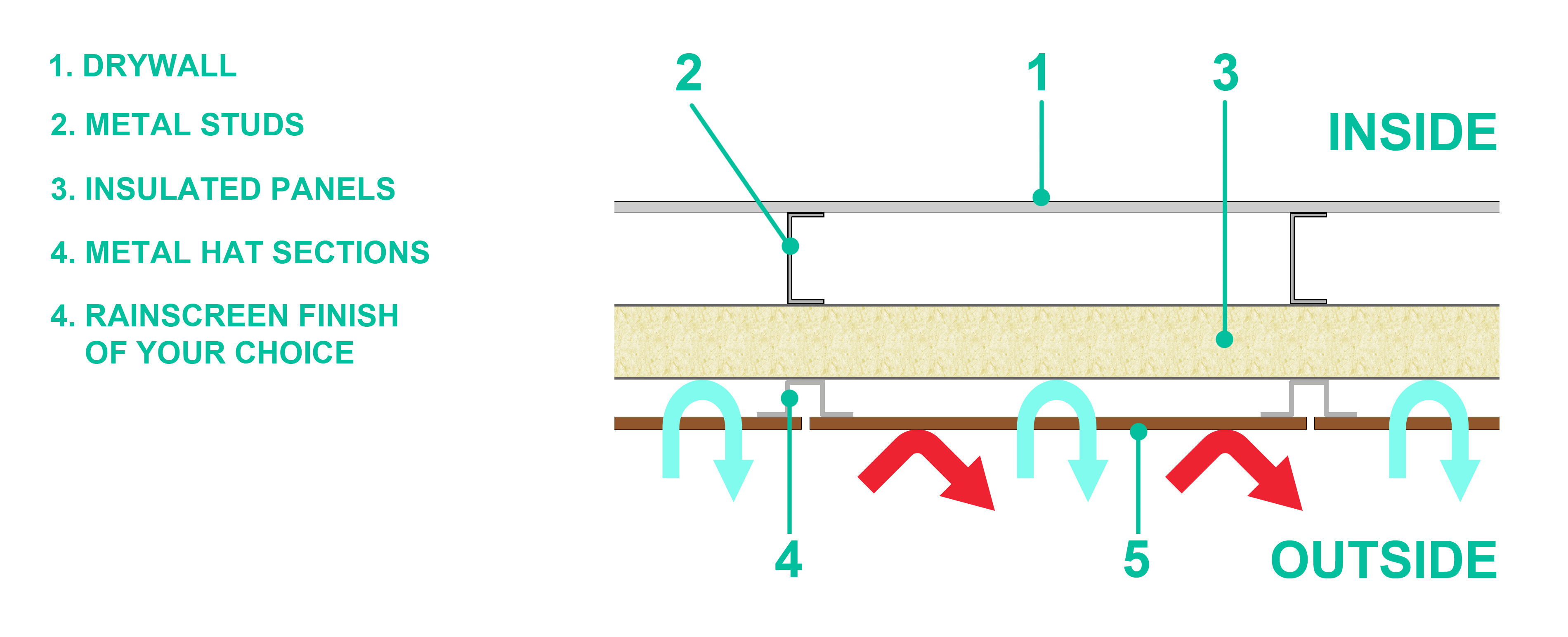 This particular assembly provides a beneficial approach to both design and performance: insulated metal panels do not offer the best finish and looks unless you are searching for an industrial/warehouse look. To compensate for this lack of aesthetics, the rain screen system allows to provide an exterior finish virtually limitless as far as colors, materials and textures.